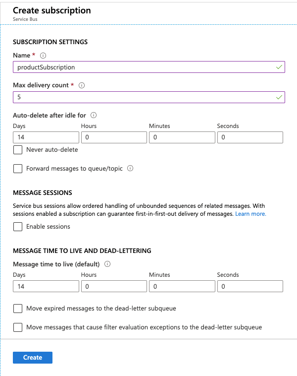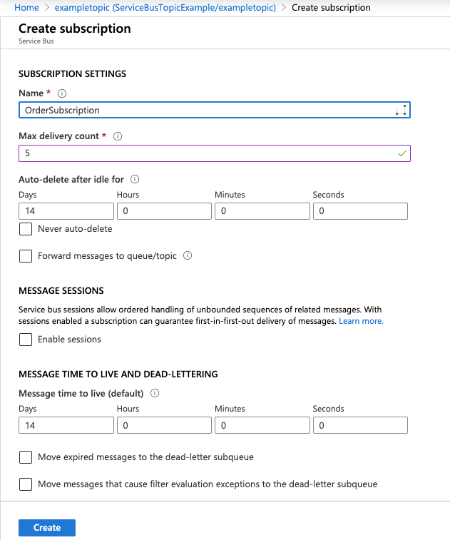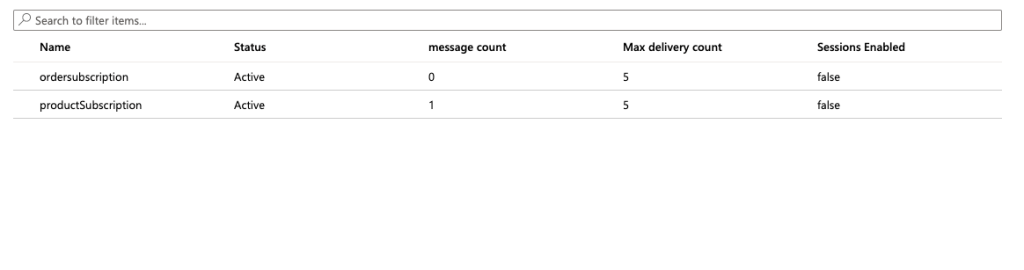 Here, I’m creating two subscriptions. one with Order subscription and other one with Product subscription. In both the subscriptions, we have solicited service bus to have maximum deliveries of message to 5, however, remaining setting are set to default. In the future articles, we’ll cover about sessions, dead lettering etc.