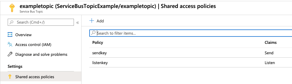 I have created two shared access policies, one for send and other one for listen i.e. we’ll use send policy in the publisher whereas listen policy for consumers(products and orders consumers).