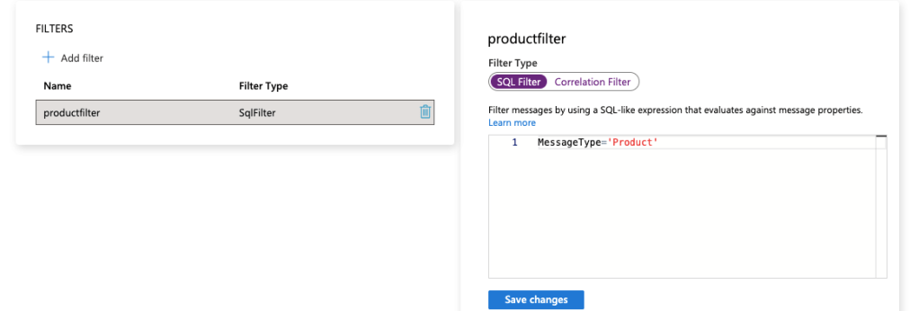 For products, I have used SQL filter. In order to receive message from topic, I have set MessageType=’Product’