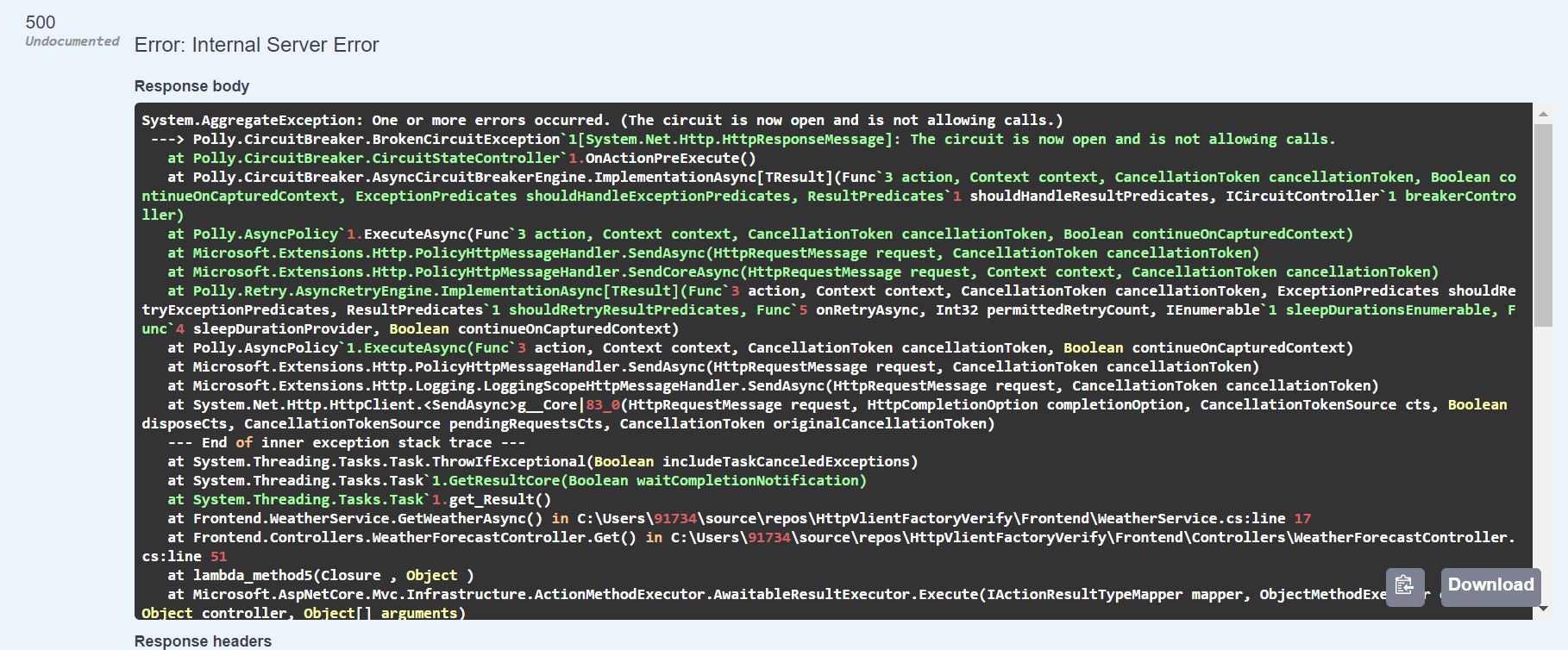 In our application, the circuit breaker switches to the open state after the weather service API fails 5 times, and the waiting period for switching the circuit breaker to a half-open state is 10 seconds.