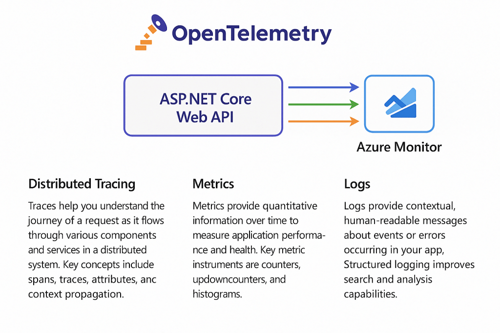 By integrating OpenTelemetry in ASP.NET Core and exporting to Azure Monitor, you gain deep insights into your application using logs, metrics, and traces. This setup ensures robust observability, enabling proactive monitoring and faster issue resolution.